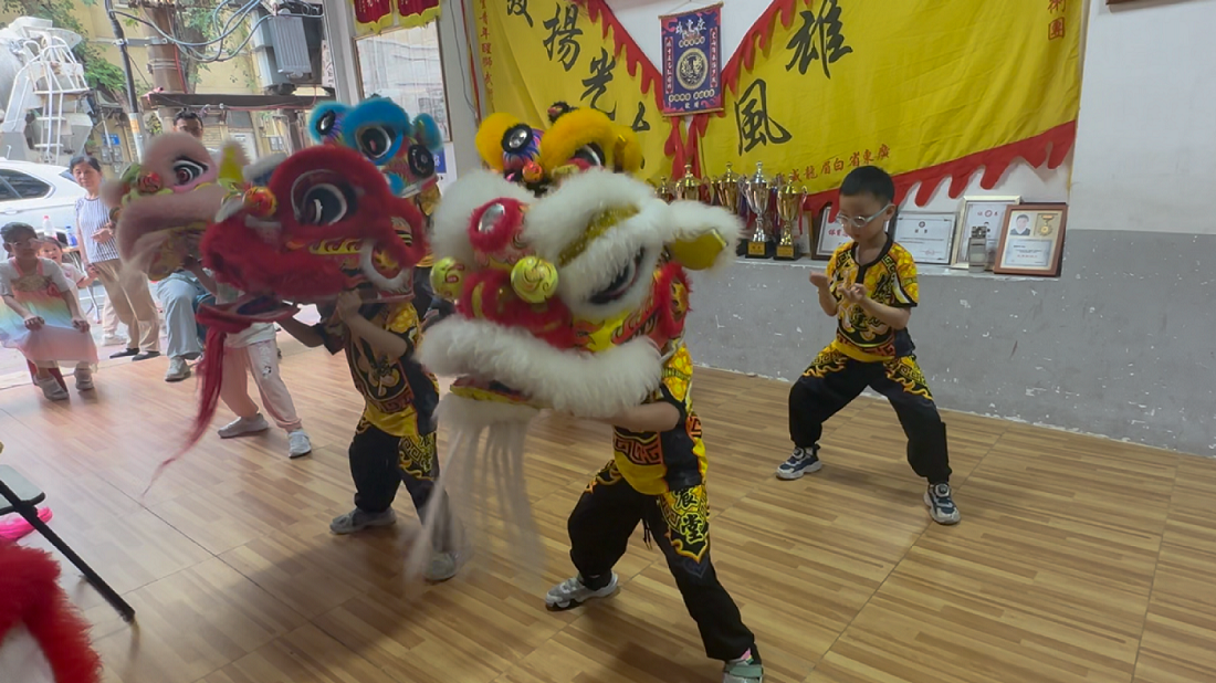 雄震堂国术龙狮馆内,孩子们舞起狮头正经其事!