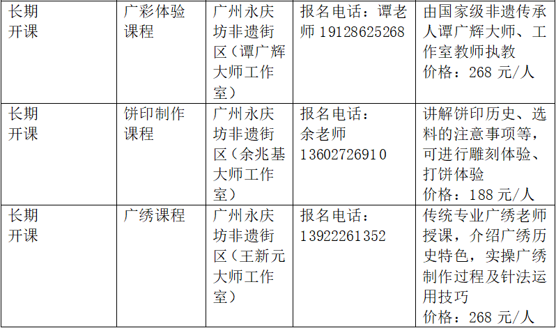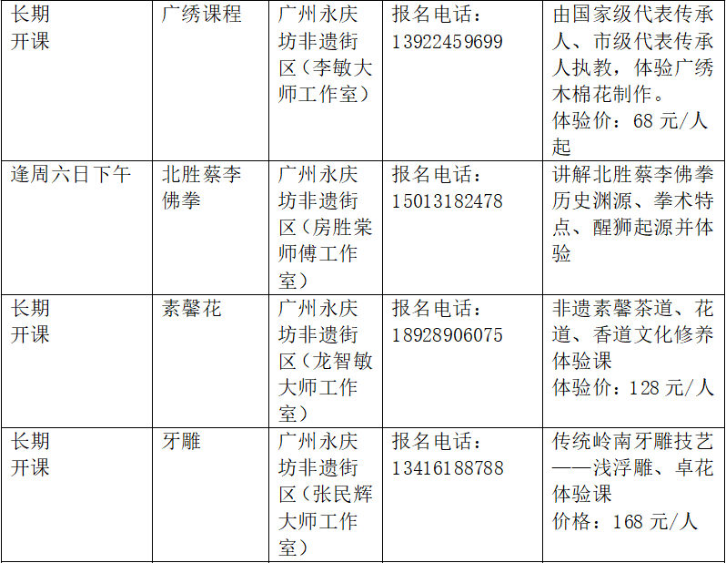 除了免费课程,在广州永庆坊的非遗街区,走廊上有一转大家职责室课程公告,涵盖广东醒狮、广彩、饼印、广绣、素馨花、牙雕等,感意思意思的亲们不错曩昔望望。一节课的价钱从几十元至300元不等,偶尔也有38元的体验课,报个一双一的钢琴课也要这个价钱,而这里有些课程能获得大家的亲授。命运好的话,大家的课程也能随到随学,但热门技俩提议提前预约,幸免因“满座”留住缺憾。