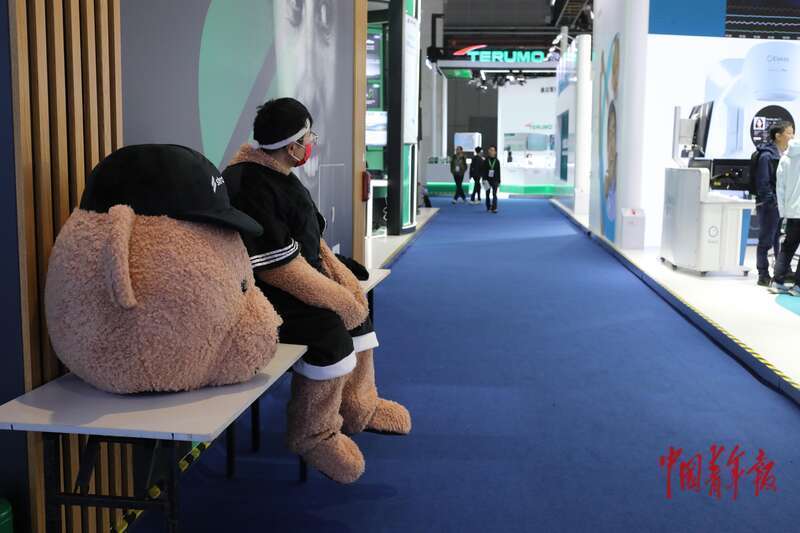 11月10日,上海国度会展中心,第八届中国外洋入口展览会医疗器械及医疗保险展区,又名职责主说念主员脱下玩偶装在会场一角休息。中青报·中青网记者 孔斯琪/摄