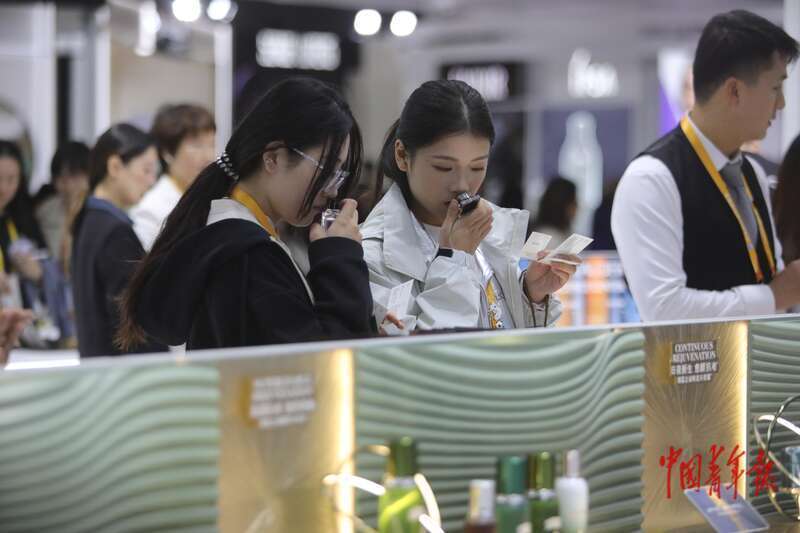 11月10日,上海国度会展中心,第八届中国外洋入口展览会糟践品展区,两名年青东说念主在试用好意思妆居品。中青报·中青网记者 孔斯琪/摄