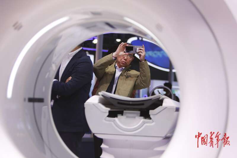 11月10日,上海国度会展中心,第八届中国外洋入口展览会医疗器械及医疗保险展区,又名参不雅者在拍摄一款智能医疗开发。中青报·中青网记者 孔斯琪/摄