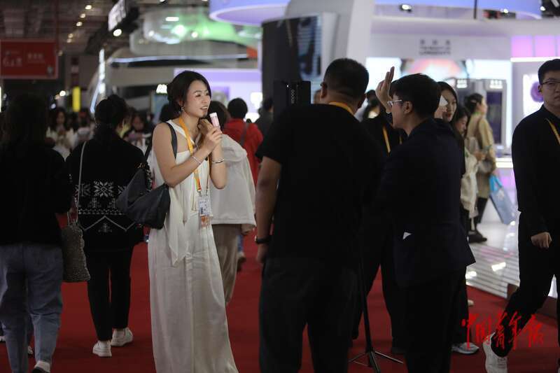 11月10日,上海国度会展中心,第八届中国外洋入口展览会糟践品展区,又名参展商在会场中现场直播带货。中青报·中青网记者 孔斯琪/摄